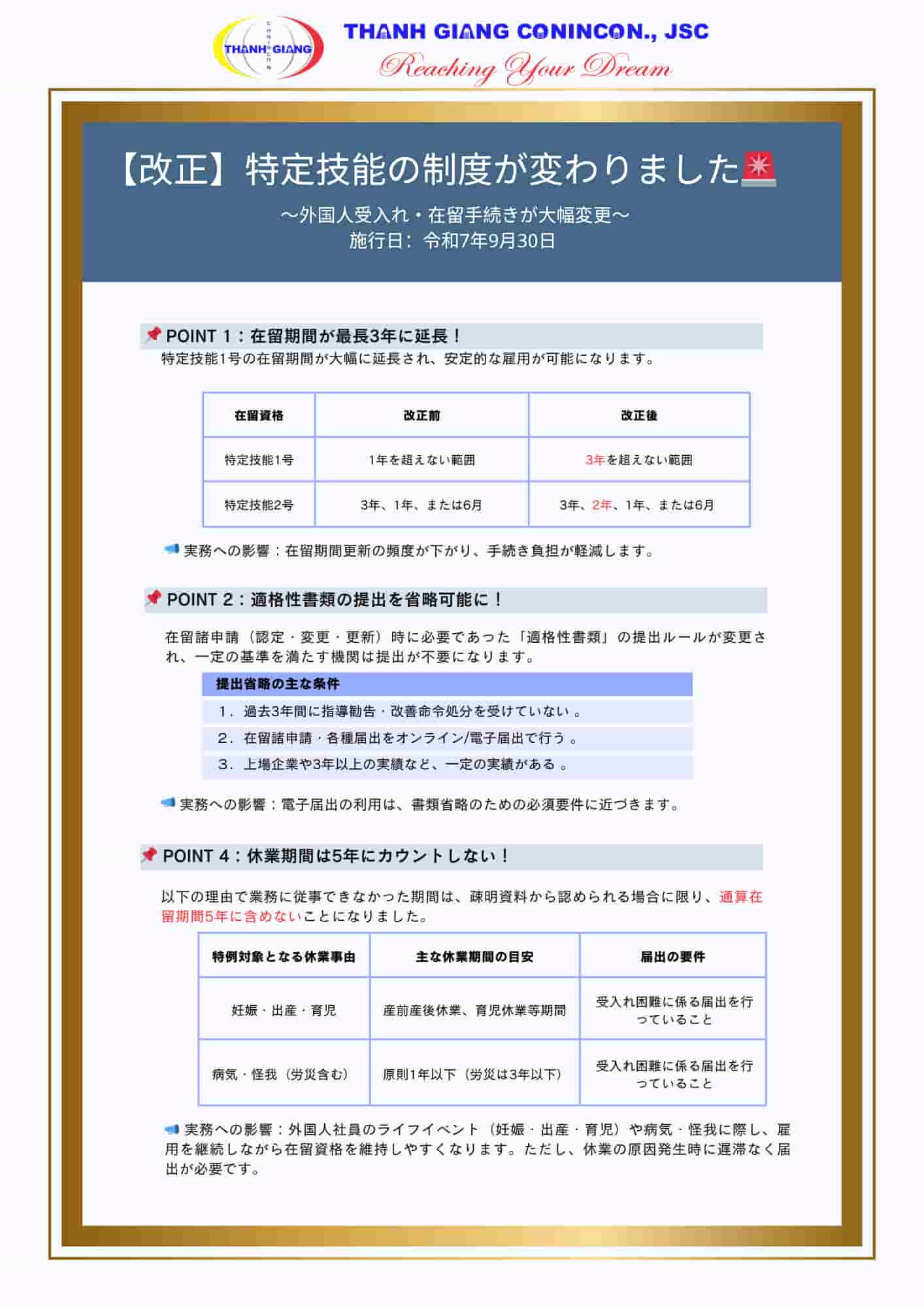 >> THÔNG TIN CHI TIẾT VỀ NỘI DUNG SỬA ĐỔI CHẾ ĐỘ TOKUTEI GINO (TỪ 30/9/2025) <<