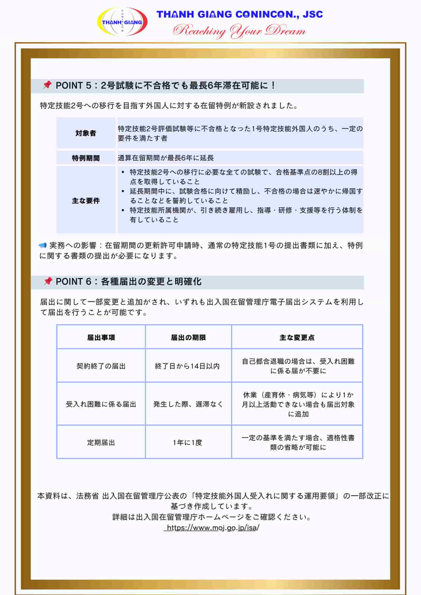 - Thời hạn lưu trú của Tokutei Gino số 1 được kéo dài từ 1 năm → tối đa 3 năm.